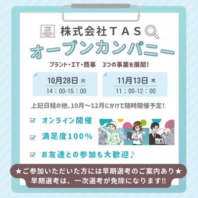 | 問い合わせ先 | 株式会社TAS 採用担当:中島 MAIL:tas_saiyou@tasnet.co.jp TEL :0770-24-3501 |
